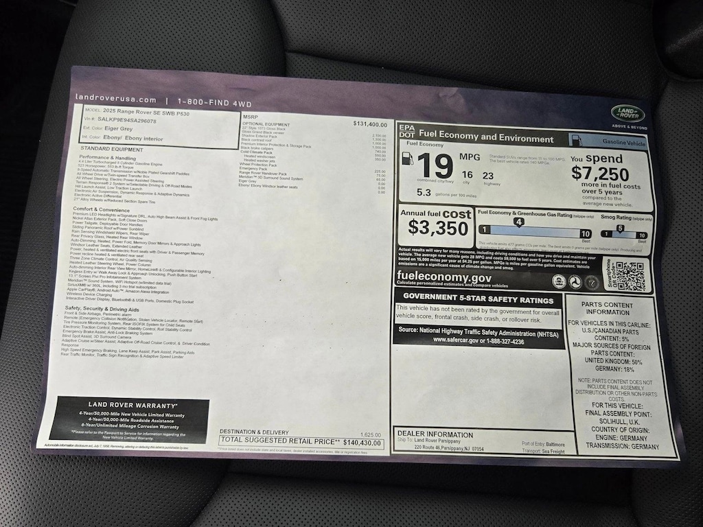 Wheels: 22" Gloss Black,Gloss Grand Black Veneer,Black Contrast Roof,Shadow Exterior Pack,Premium Interior Protection & Storage Pack,Panoramic Roof,Black Brake Calipers,Leather Seats,Navigation System,Cold Climate Pack,Emergency Pack,Lane Keeping Assist,Range Rover Handover Pack,Keyless Start,Rear Spoiler,Cooled Front Seat(S),Ebony; Perforated Windsor Leather Seat Trim,Eiger Grey Metallic